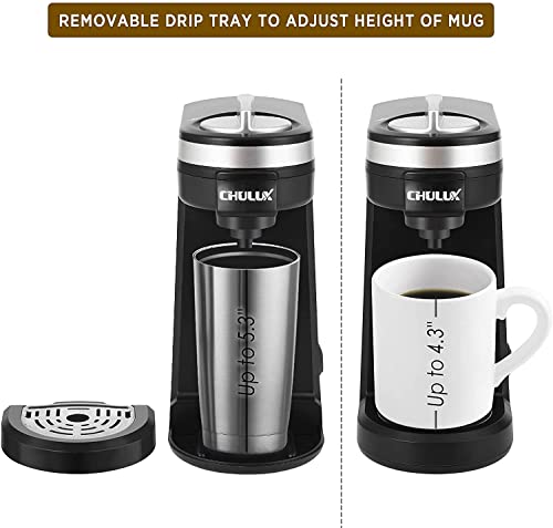 Specification: CHULUX Coffee Maker Single Serve for K Cups Pod Capsule Ground Coffee Tea, Mini Coffee Maker Single Cup Coffee Brewer 5-12oz, One Touch Fast Brewing Simply Coffee Maker with Resusable Coffee Filter