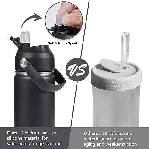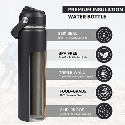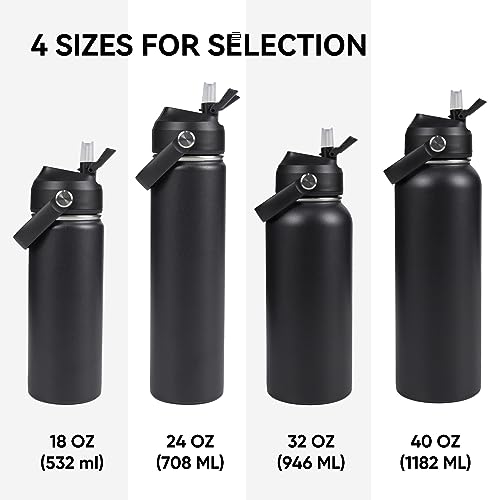 Kerilyn Stainless Steel Insulated Water Bottle, 24oz Double Wall Vacuum Insulated Water Bottle Leak Proof with Silicone Straw, Wide Mouth Lid, BPA Free, Keep Cold and Hot, 24oz, Black
