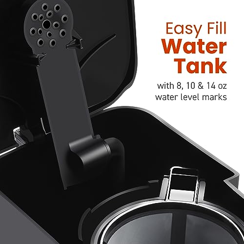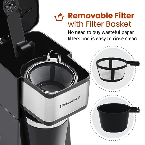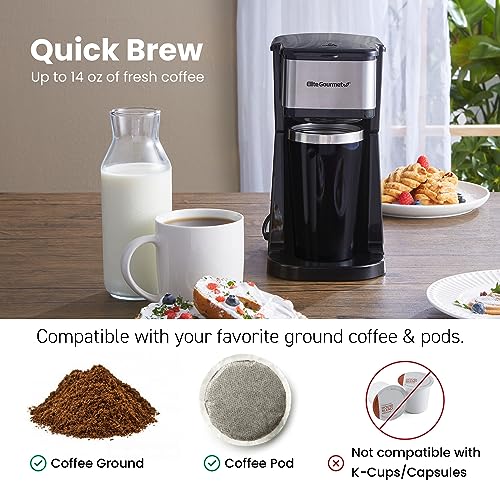 Elite Gourmet EHC114 Personal Single-Serve Compact Coffee Maker Brewer Includes 14Oz. Thermal Travel Mug with Stainless Steel Interior, Compatible with Coffee Grounds, Reusable Filter, Black